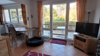 Von der Wohnzimmerterrasse blickt man in den hausgemeinschaftlichen Park, den Dünengarten. Die Ferienwohnung ist